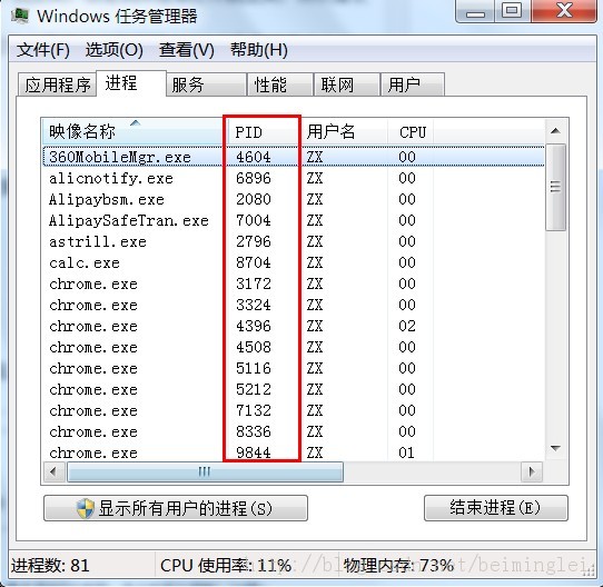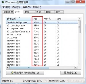 PS:如何查看PID的方法,在上面窗口中點(diǎn)擊查看->選擇列->勾選PID就好了,嘻嘻。