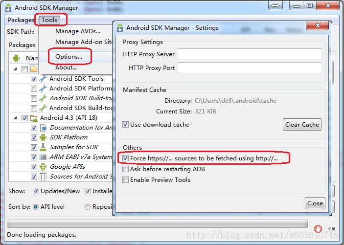 修改方法是:如下圖,在Android SDK Manager->Tools-Options...選項(xiàng)界面,